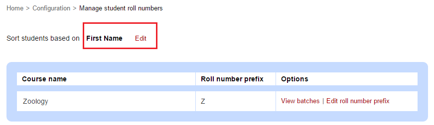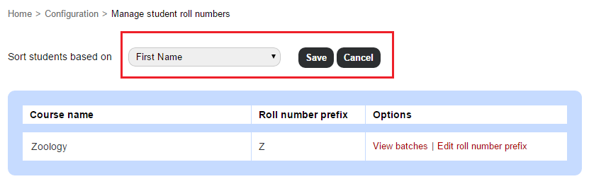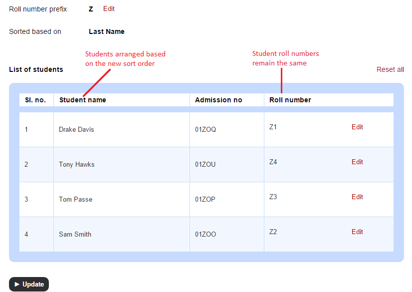 Students can be sorted by Admission no., First Name, or Last Name. Based on the sort order, roll numbers can then be assigned for all students of each class. The student sort order can be changed at any time. If you change the student sort order ...