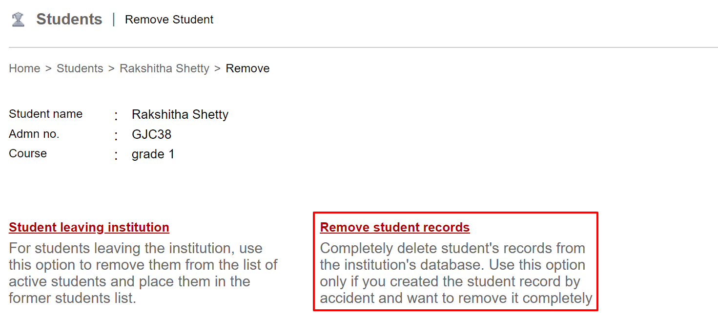 Remove student records – Use this option to delete all information associated with the student. Once deleted, the student account can't be restored so make sure there is no longer any need for it