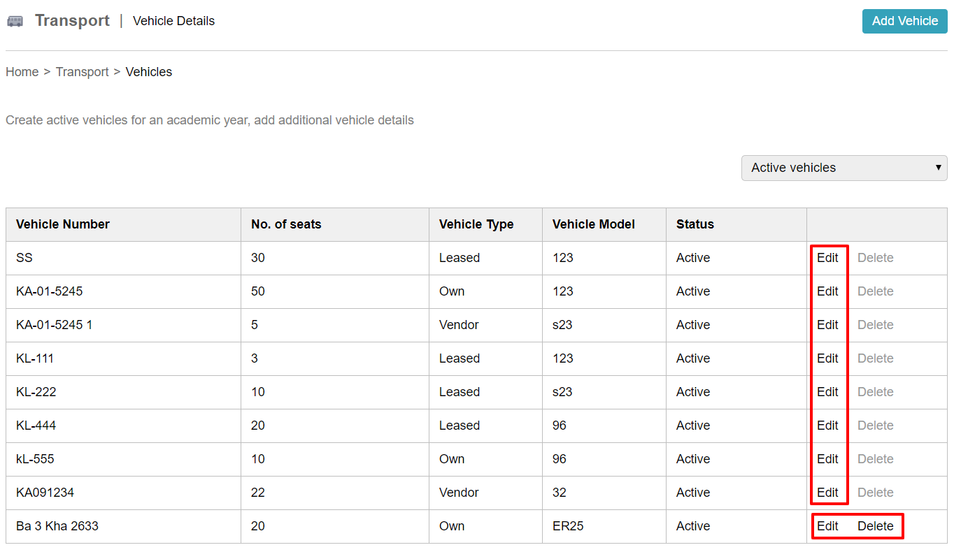You can edit, inactivate or delete vehicle details only if the vehicle is not used to record vehicle information. At the top of your dashboard, click the module access icon > Administration > Transport > Vehicles to open the Vehicle Details page. ...