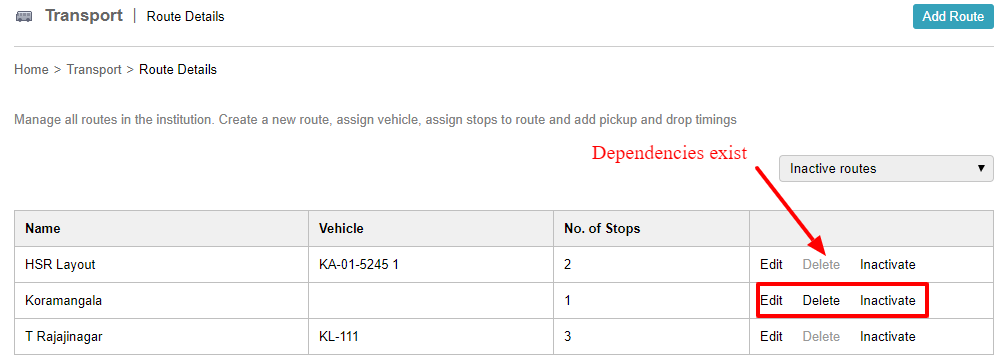 Click Edit beside the route to edit the route details, Inactivate to inactivate the route details or click Delete beside the route you want to delete (possible only if there are not dependencies).
