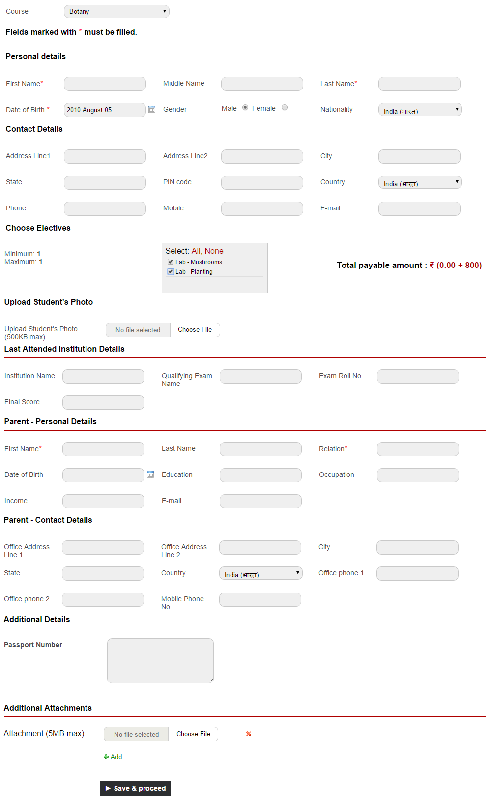 Based on how you’ve set up the Years, applicants can register for Years either with a PIN number or without a PIN number. After selecting the Year and entering the PIN number, the admission form is displayed. The applicant will be required to provide the following information: