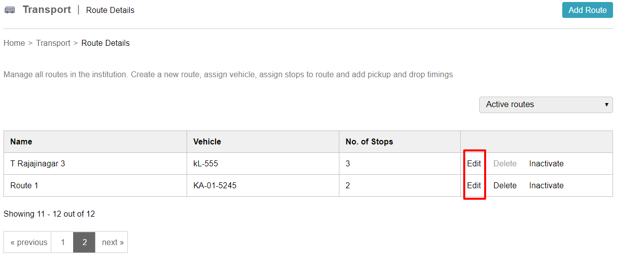 Administration > Transport > Routes to open the Route Details page.- In the Route Details page, click the Edit link against a route for which you wish to add new stop details.