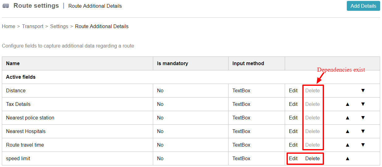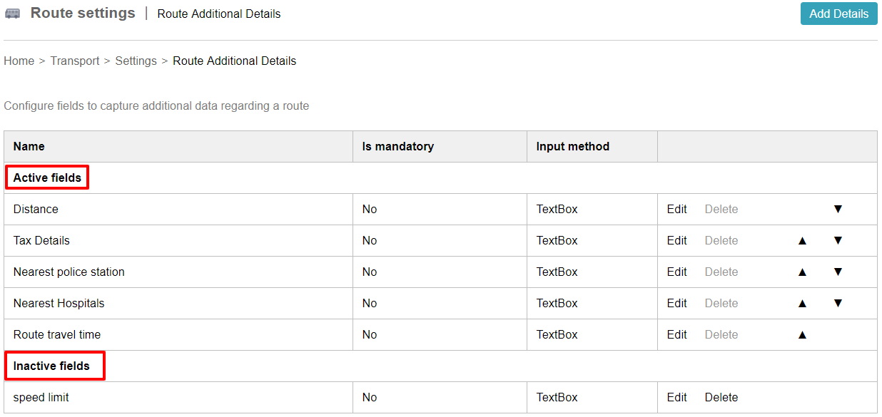 If you do not want an additional detail field to be displayed when setting vehicle routes, you can inactivate it or delete it. However, you cannot delete an additional detail field that has already been used to record vehicle route information.