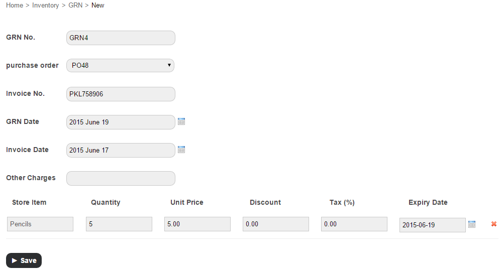 In the GRN Date field, select the GRN date. The GRN date cannot be earlier than the purchase order date.